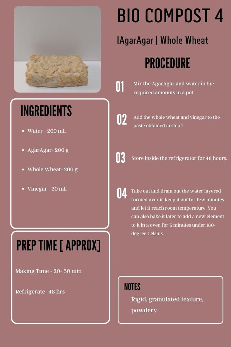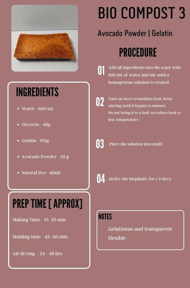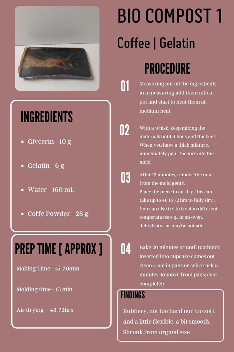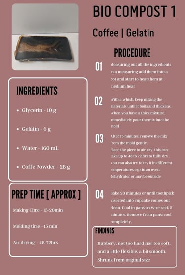 I started experimenting with the materials, altering different ingredients each time and creating a variety of samples and understanding how each sample/material can show different properties and uses. I created various samples each with a different characteristic and quality. I documented each step and made a final ingredient page for the best bio-composites created.