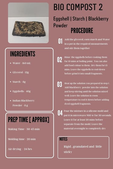 Drawing inspiration from open-source and creative resources available online, I experimented with existing recipes and evolved them through my own trials and documentation. Through this process, I gained a deeper understanding of the challenges and possibilities in creating eco-friendly materials