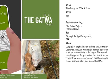 THE GATWA Project is a comprehensive initiative aimed at addressing the pressing issue of stray cat welfare in the UAE. Recognizing the significant challenges faced by stray cats, including high mortality rates due to illness and neglect, our team of design thinkers and strategists set out to create a sustainable solution. Through extensive research, interviews, and ideation techniques such as Brainwriting 635, we identified the need for a platform that would connect cat lovers and provide essential resources for the care and well-being of stray cats.