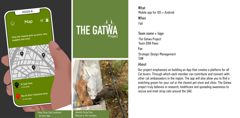 The GATWA Project - truly believes in research, healthcare and spreading awareness to rescue and treat stray cats around the UAE. We recommended an app that would serve as a platform to connect all Cat lovers and serve the needs of cats and cat lovers.