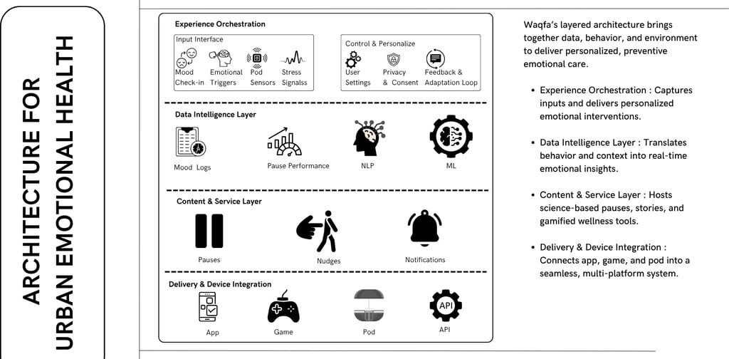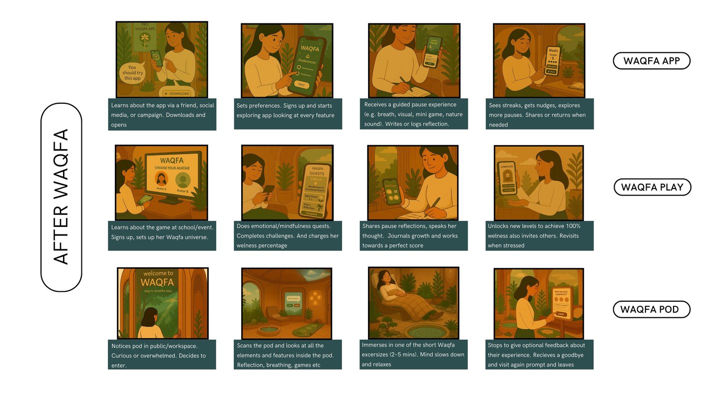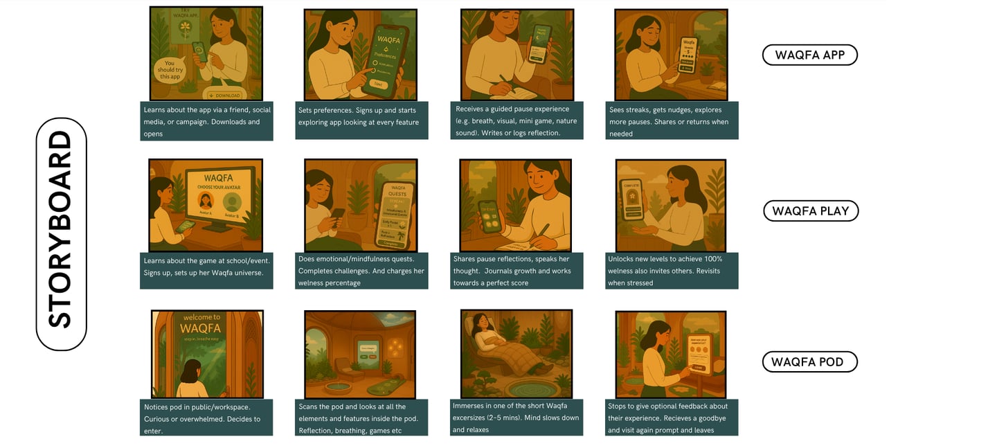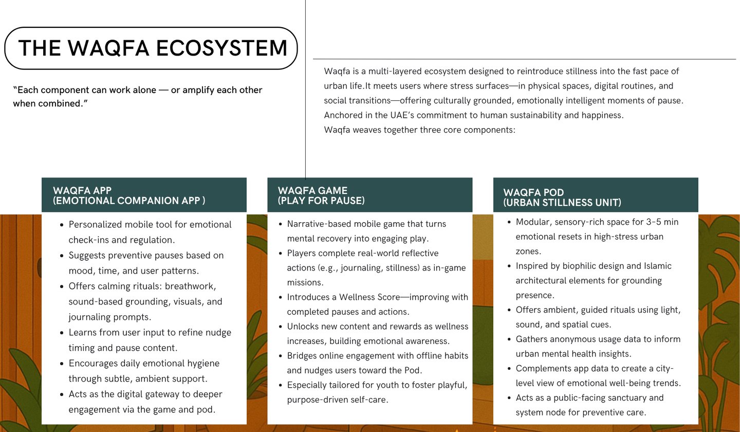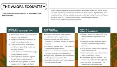 Waqfa is a modular system of recovery —right where daily stress builds. It is preventive care that includes a mobile app, a narrative game, and an immersive physical pod — designed to work together or stand alone. It transforms emotional recovery into a daily practice by embedding support where stress happens.