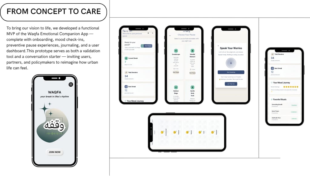 Waqfa reimagines pause as a public good, rooted in cultural traditions of waqf (charitable endowment), and design interventions that make emotional balance accessible—exactly when and where people need it most.
