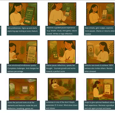 Waqfa is being shaped through a layered and human-centered design process that brought together qualitative research, behavioral mapping, and iterative prototyping. I began by identifying four core personas—each representing different urban stress experiences across students, professionals, and gig workers. Using journey maps, I traced how stress accumulates across time and space. A survey of over 50 users deepened these insights, revealing common unmet needs. These findings informed early sketches and AI-generated visual renders that helped bring Waqfa’s emotional and spatial experience to life.