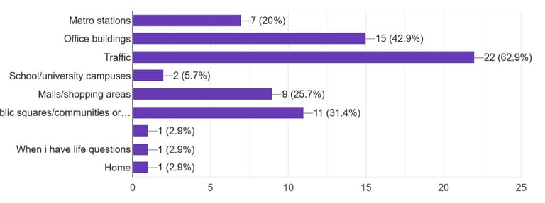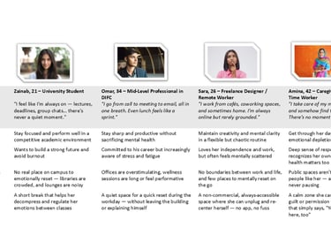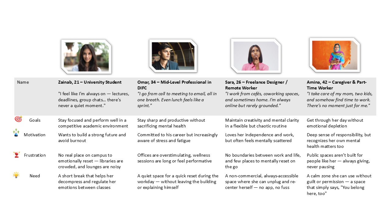 Waqfa was shaped through a layered and human-centered design process that brought together qualitative research, behavioral mapping, and iterative prototyping. I began by identifying four core personas—each representing different urban stress experiences across students, professionals, and gig workers. Using journey maps, I traced how stress accumulates across time and space. A survey of over 50 users deepened these insights, revealing common unmet needs. These findings informed early sketches and AI-generated visual renders that helped bring Waqfa’s emotional and spatial experience to life.