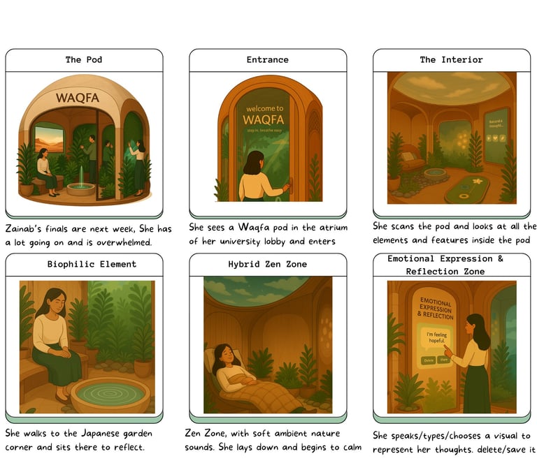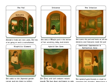 The AI-generated renders illustrate the sensory and emotional experience at the heart of Waqfa. Rather than showing a static pod, they capture how the space adapts to user needs — offering moments of calm, interaction, reflection, and recovery. These visual explorations communicate the spatial atmosphere, emotional tone, and design intent behind Waqfa as a public intervention for mental wellbeing.